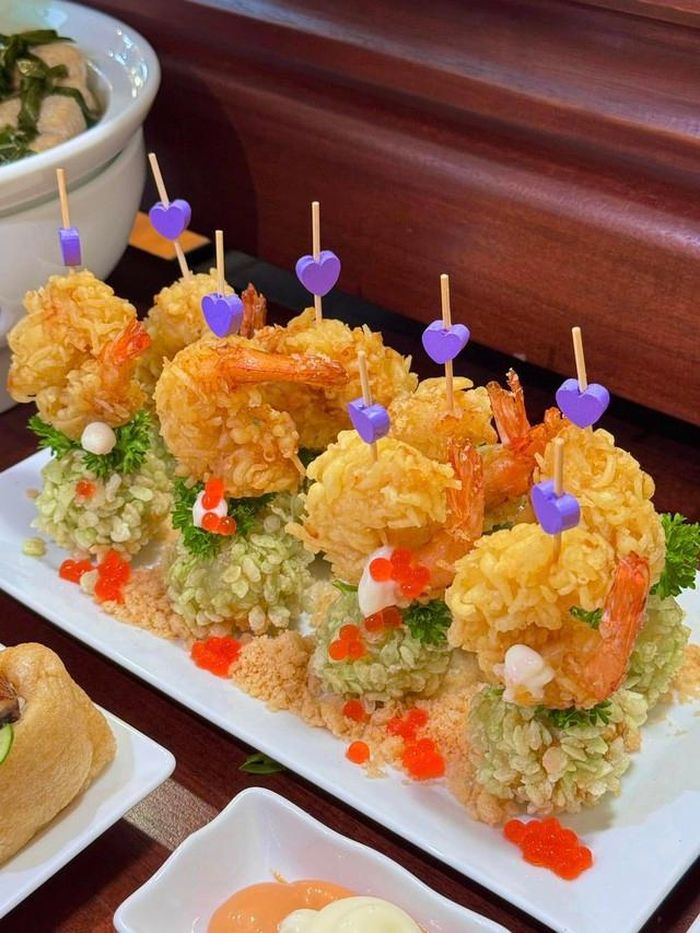 Trứng cút bọc cốm xiên tôm tempura. (Ảnh: NVCC)