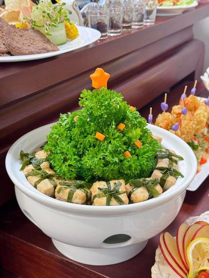 Phần rau xanh được xếp tầng khéo léo, chụm lại thành hình tháp, trên cùng gắn một "ngôi sao" cắt từ cà rốt. Xung quanh "tán lá" còn điểm xuyết những miếng cà rốt nhỏ màu cam như "trái châu" trang trí Giáng sinh.