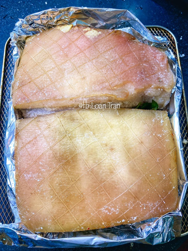 Bạn bọc thịt lại bằng tờ giấy bạc khác cho sạch và vẫn để lá mắc mật ở dưới. Cho thịt vào nồi chiên không dầu và nướng ở 200 độ C trong 40 phút. Lưu ý tuyệt đối lúc đang nổ bì thì không đước mở nồi, vì nếu làm như thế nhiệt bị giảm và bì không nổ.