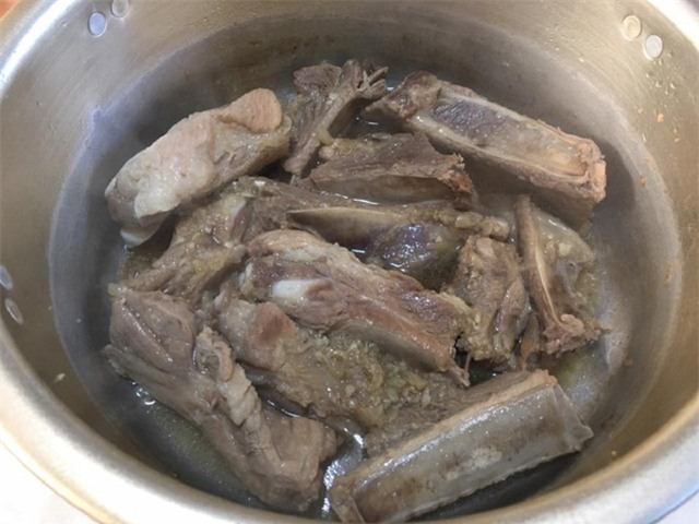 Đem bắc lên bếp nấu, đợi nước sôi thì hạ lửa vừa, đun đến khi nước cạn còn nửa chén cơm, quy trình này mất độ 20 phút. Gắp sườn ra đĩa, giữ lại nước luộc sườn.