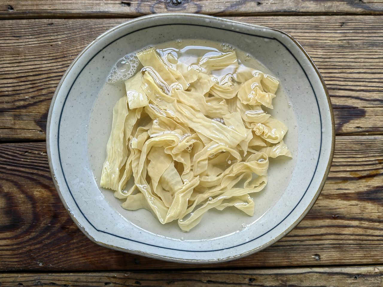 Váng đậu sau khi ngâm mềm thì luộc sôi khoảng 1 phút rồi vớt ra để ráo nước.
