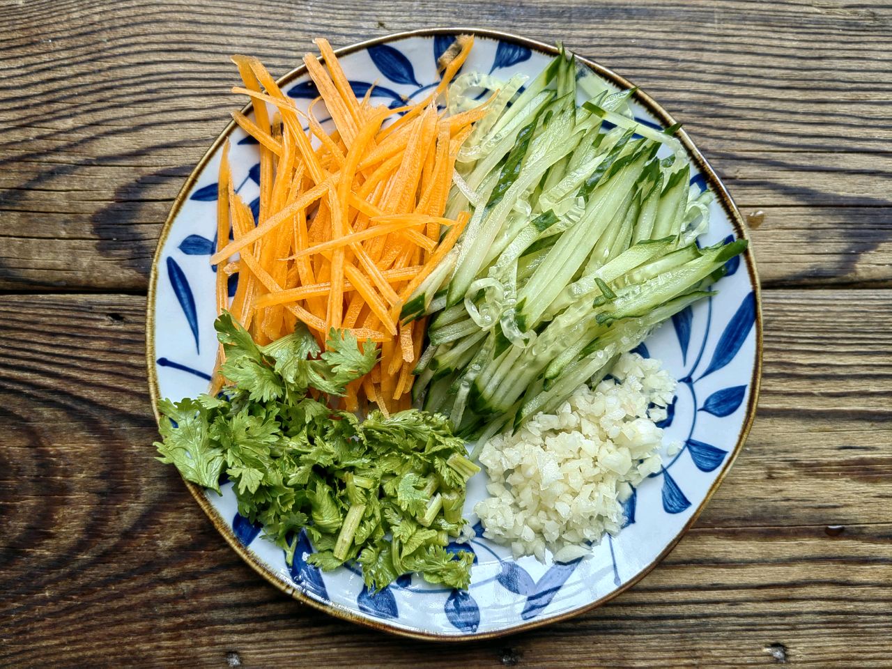 Cà rốt, dưa chuột sơ chế sạch sau đó bào sợi. Rau mùi thái nhỏ, tỏi băm nhỏ.