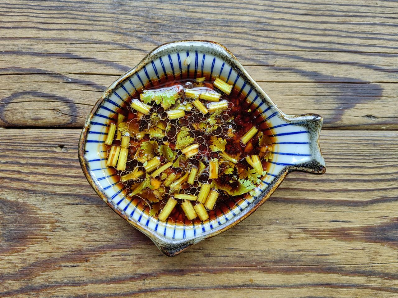 Lấy một bát nhỏ, cho tỏi băm, một ít rau mùi thái nhỏ, tiếp đó thêm 30ml nước tương, 15ml dầu hào, 15ml giấm, 5g đường và 5ml dầu mè vào khuấy đều.