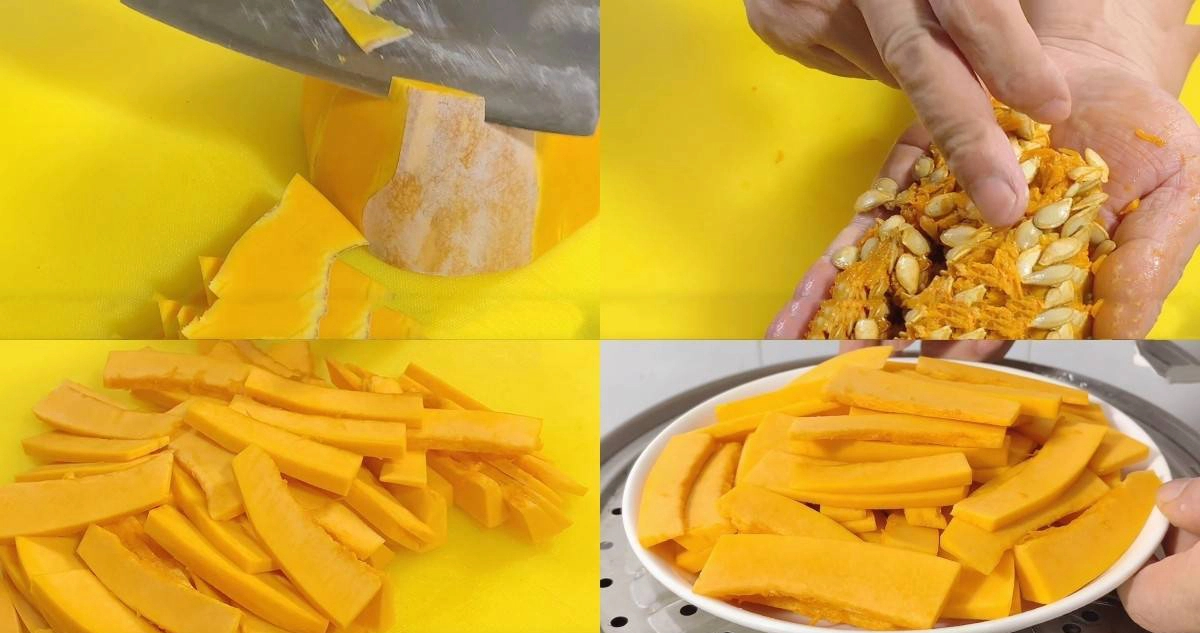 Bí mang gọt vỏ, rửa sạch. Cắt bí thành các miếng nhỏ. Cho bí đã cắt vào nồi, hấp chín trong khoảng 15 phút.