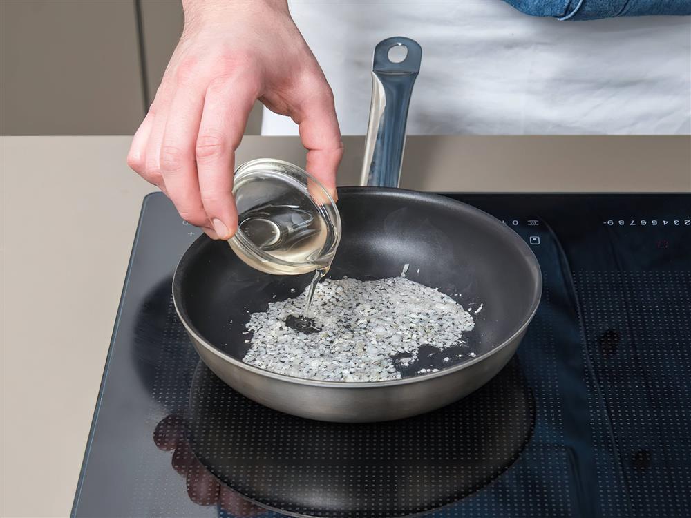 Phi thơm hành tím và tỏi khoảng 2 phút sau đó thêm mirin, xì dầu.