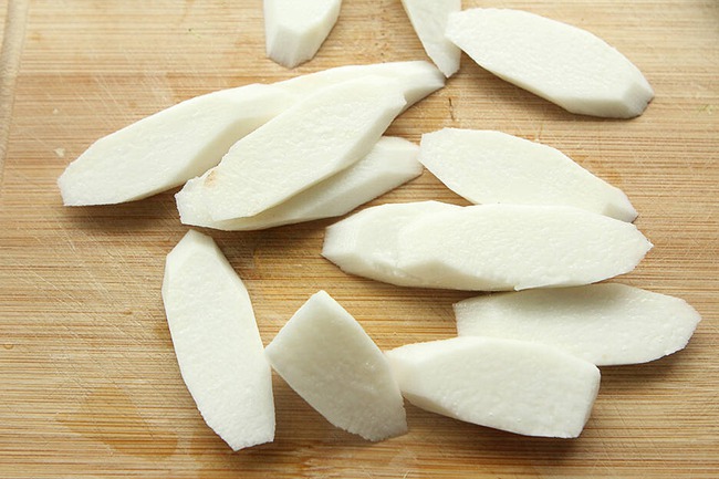 Trước tiên, gọt bỏ phần vỏ củ mài. Chúng có thể ngứa nên hãy đeo găng tay để tránh dị ứng. Rửa sạch cùng nước muối loãng. Cắt xéo từng miếng chừng 5mm là được.