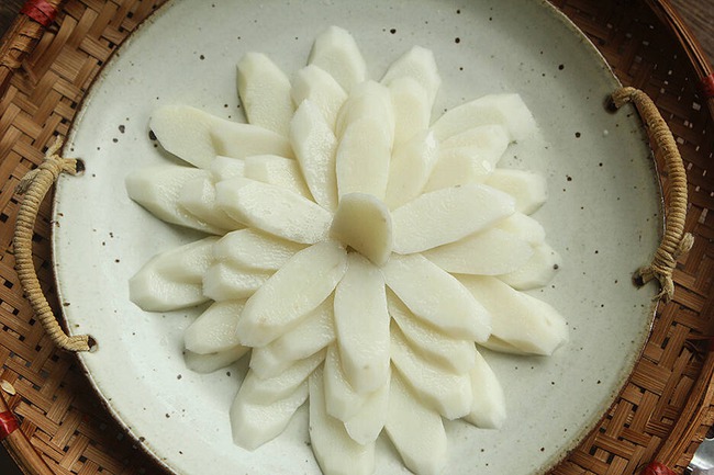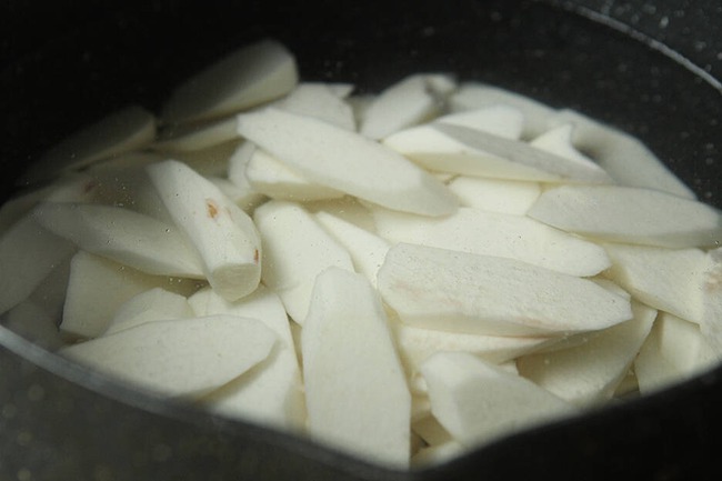 Độ dày như vậy vừa phải giúp củ mài nhanh chín đồng thời trình bày cũng được đẹp mắt hơn. Chuẩn bị bát nước lạnh, sau khi cắt củ mài nên thả vào nước để tránh bị thâm màu.