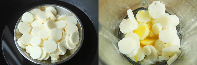 Gọt vỏ củ mài, loại bỏ nhớt và cắt thành từng miếng nhỏ. Cho vào xửng hấp chín. Dầm nhuyễn củ mài trộn cùng trứng gà, bột mì, đường thành khối bột nhão.