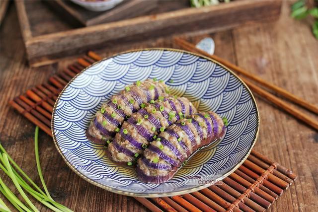 Thịt heo rửa sạch, băm nhỏ, ước lượng gia vị rồi trộn đều, để sang một bên. Cà tím cắt lát bằng nhau, rộng 0,5 cm, sau đó nhét thịt băm vào ở giữa, cho lên đĩa hấp trong 15 phút.