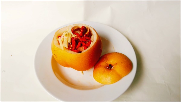 Nguyên liệu phần còn dư thì để trong tô. Cho nước vào trong quả lê và tô luôn.