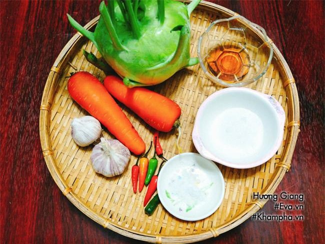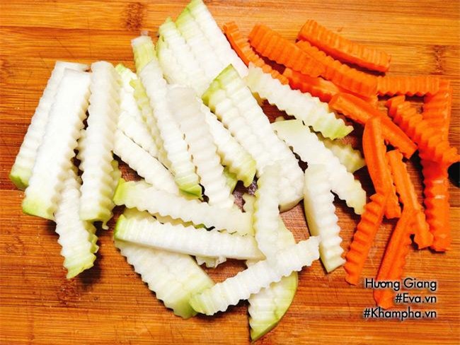 Bước 1: Su hào và cà rốt đem gọt sạch vỏ sau đó rửa sạch, dùng dao gợn sóng thái thành những thanh dài vừa ăn, nếu không có dao gợn sóng bạn dùng dao thường đều được.