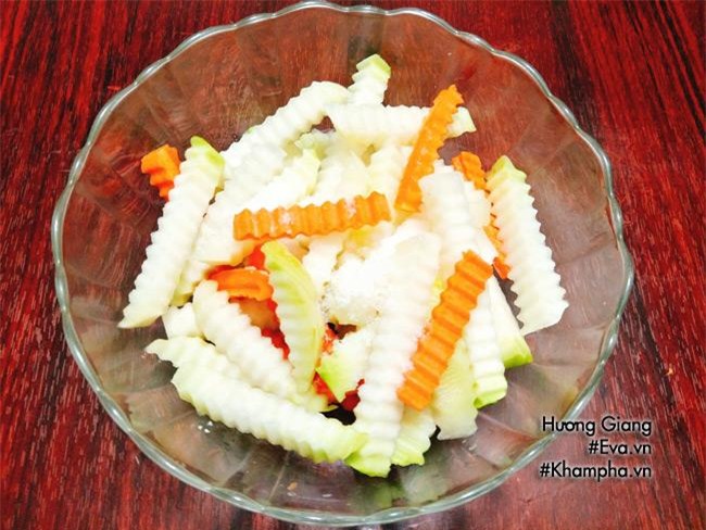 Bước 2: Cho su hào và cà rốt vào âu rồi thêm 1 thìa muối, xóc thật đều rồi để 20 phút thì chắt bỏ nước su hào tiết ra, bạn không cần rửa lại nữa.