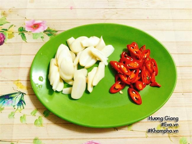 Bước 3: Ớt rửa sạch, thái khúc ngắn hoặc miếng vát chéo, tỏi bóc sạch vỏ rồi thái mỏng.