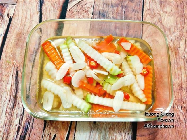 Bước 5: Bạn xếp su hào và cà rốt vào hũ sạch sau đó đổ hỗn hợp nước mắm đường tỏi ớt vào ngập su hào là được.