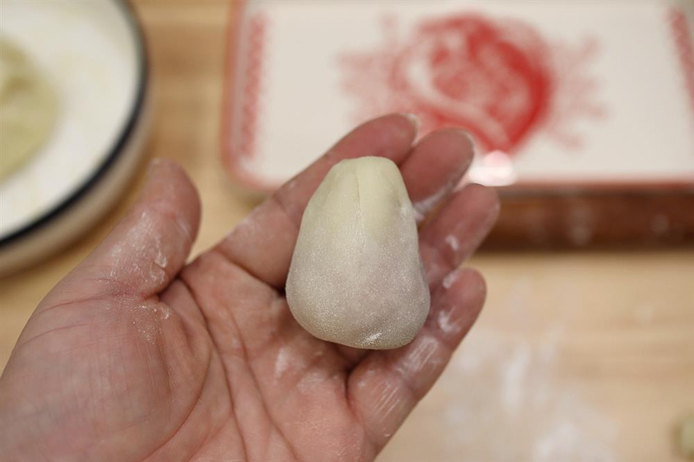 10. Bọc thật chặt tay bằng nắm nếp, phần bột thừa có thể bỏ bớt. Nặn viên bột theo hình trái dâu. Trên mặt bánh có một ít bột nếp nên dù để nhiều miếng bánh cũng không dính.