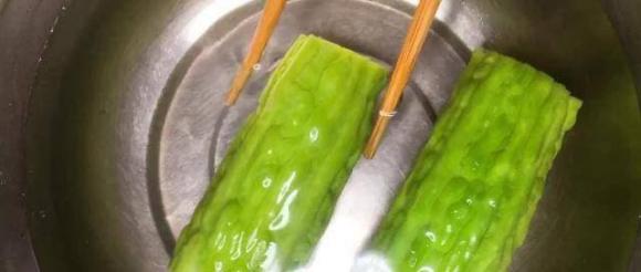 Cho mướp đắng đã sơ chế vào nước nóng, chần qua 60 giây rồi đổ vào nước sôi để nguội lần 2. Mục đích của bước này là để loại bỏ vị đắng và hăng của mướp.
