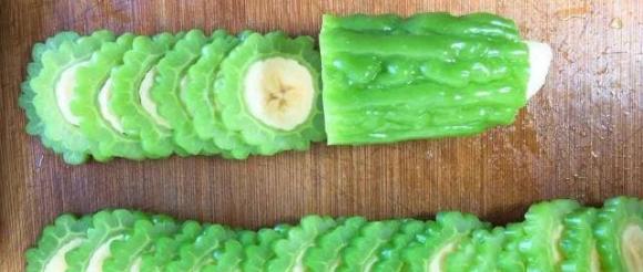 Sau đó, bạn nhồi cùi chuối đã bóc vỏ vào trái mướp đắng, dùng dao gọt hoa quả cắt thành từng khoanh 5 mm, xếp ngay ngắn vào đĩa, như hình dưới.