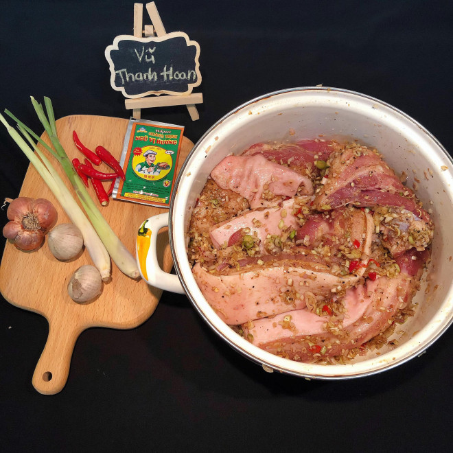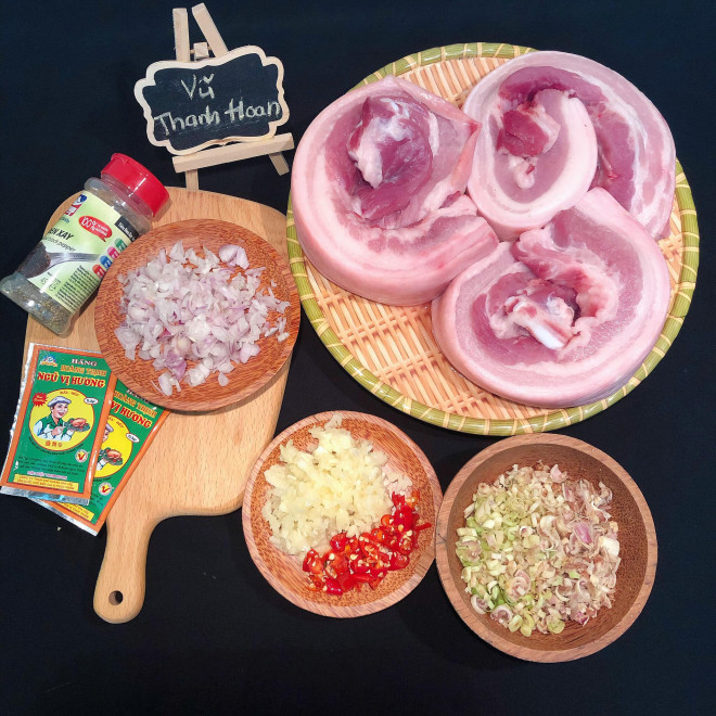 Nguyên liệu: 3 miếng thịt là 1,3kg; 4 củ xả băm nhuyễn; 4 củ tỏi băm nhuyễn; 1 gói ngũ vị hương ; 3 quả ớt băm nhỏ; 3 thìa nước mắm; 2 thìa đường; 2 thìa dầu hào; hạt tiêu.