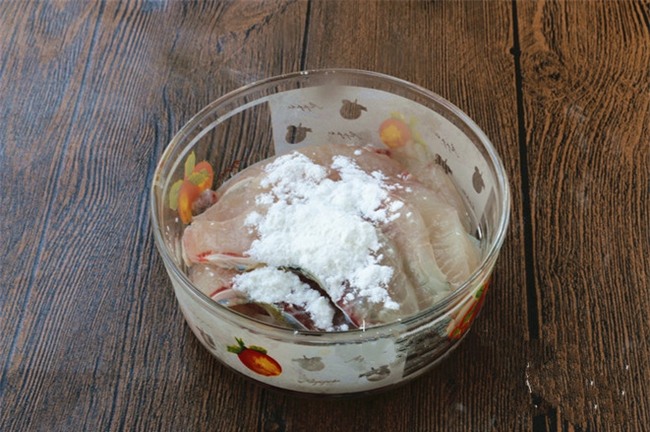 Cá rửa sạch thái lát cho vào bát, thêm muối, hạt tiêu, một ít bột ngô và một ít dầu ăn vào trộn đều.