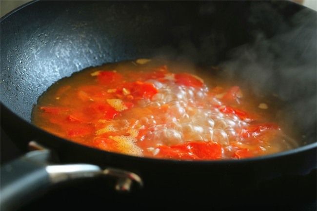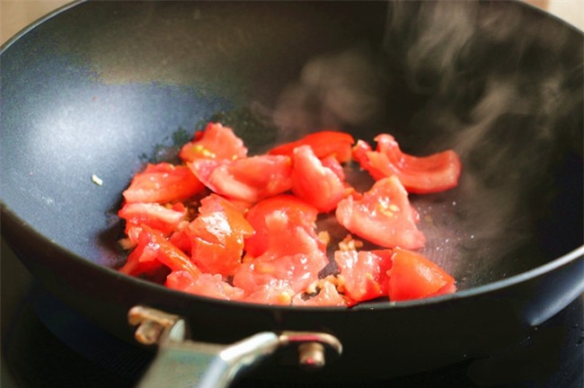 Cho một ít dầu ăn vào chảo sâu lòng, thêm tỏi băm vào xào thơm. Tiếp đó cho cà chua vào xào qua.