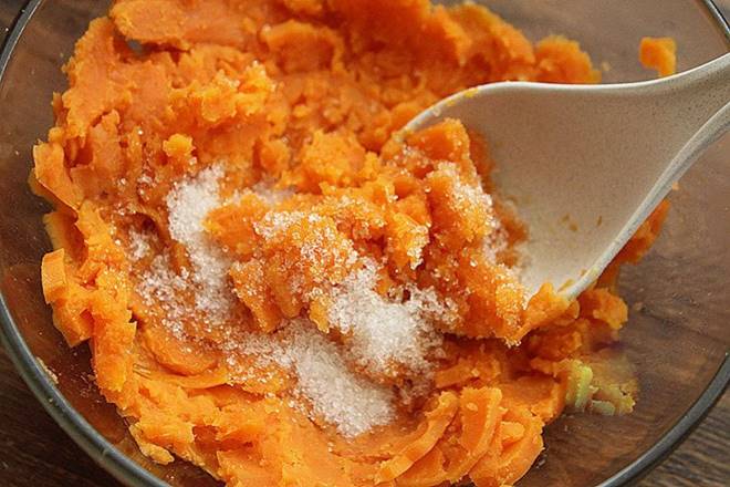 Khoai lang gọt vỏ, rửa sạch, sau đó gọt vỏ, cắt khúc rồi cho vào nồi hấp chín. Sau khi khoai lang hấp chín, cho đường vừa ăn vào, dầm nát và trộn đều.