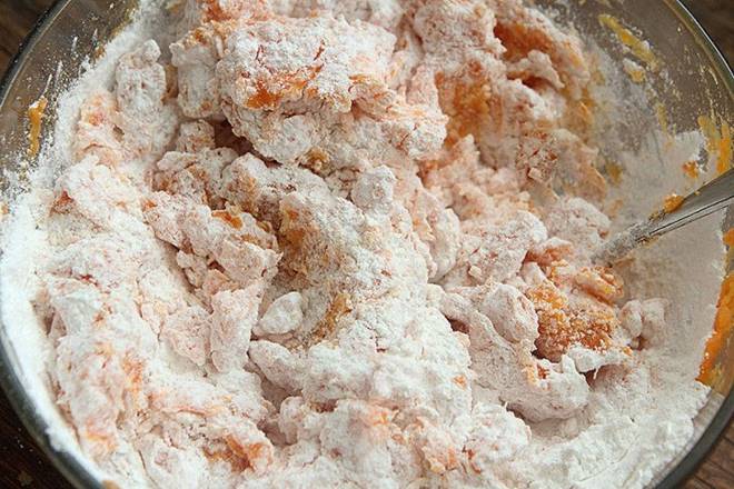 Đổ bột gạo nếp vào hỗn hợp khoai lang đã dầm nát, sau đó thêm nước ấm rồi nhào thành một khối mịn không dính tay.