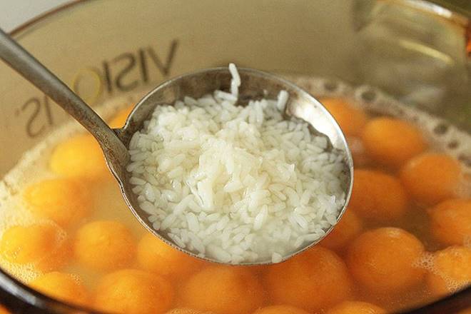 Sau khi các viên khoai lang nổi lên trên mặt nước, cho muôi cơm rượu nếp vào, có thể tăng giảm lượng cơm rượu tùy theo khẩu vị yêu thích, trộn đều xong thì tắt bếp.