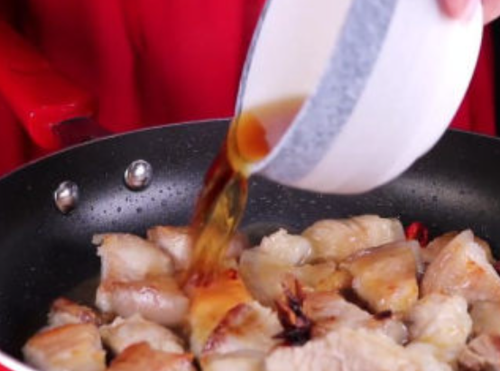Bước 4: Bạn đặt nồi thịt lên bếp, đảo một lúc rồi đổ nước hàng vào. Tiếp theo thêm rượu hoa điêu, lượng nước vừa đủ ngập mặt thịt heo. Sau đó bắt đầu nêm gia vị. Bạn cho 1 thìa muối, 1 thìa đường (có thể cho nhiều hơn nếu thích ngọt), 1 thìa nước cốt gà, 1 thìa nhỏ dầu ớt đỏ, một thìa nước tương và một thìa hắc xì dầu vào rồi khuấy đều và đậy nắp.