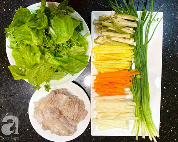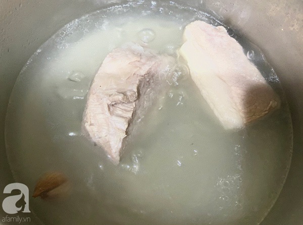 - Thịt lợn rửa sạch, chia làm 2, bỏ vào nồi, đổ nước ngập thịt, cho vào 1 thìa cafe muối, luộc sơ trong 10 phút, đổ ra và rửa sạch thịt (bước này giúp thịt thơm ngọt, không bị hôi). Tiếp tục cho thịt vào nồi nước mới với 1 thìa gia vị, và 2 củ hành khô, luộc trong khoảng 20'. Khi thịt chín, chuẩn bị 1 âu nước sôi để nguội, gắp miếng thịt từ nồi nước sôi ra thả vào sao cho ngập miếng thịt. Đợi thịt nguội vớt ra thái mỏng.