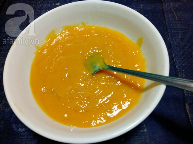 Xoài chín gọt vỏ rồi thái nhỏ, cho vào máy sinh tố xay nhuyễn cùng với 1 ít nước lọc. Sau đó, lọc xoài qua ray để lấy phần thịt xoài nhuyễn mịn.
