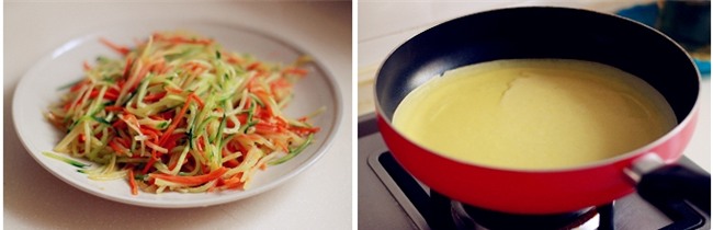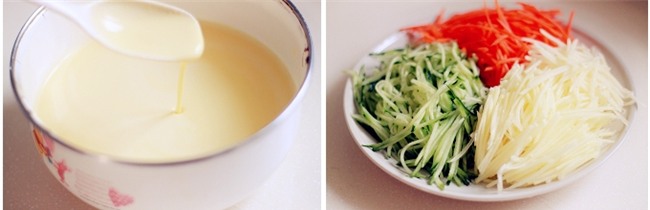 Rây bột mỳ vào âu cho mịn sau đó đập trứng vào, thêm nước vừa phải và khuấy đều bằng phới lồng cho đến khi hỗn hợp mịn mượt. Lượng nước gia giảm sao cho bột hơi sệt là được. Tiếp đến chuẩn bị dưa chuột, cà rốt và khoai tây bào sợi.