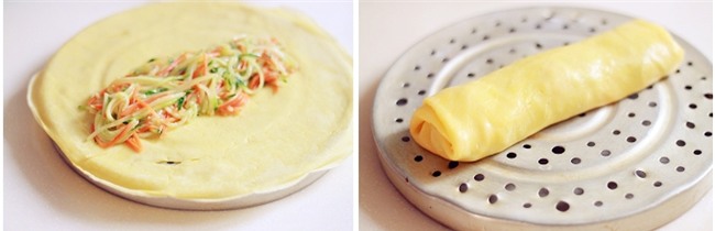 Trải lớp vỏ bánh crepe đã tráng ra đĩa, cho củ quả xào vào rồi gấp mép hai bên vỏ bánh và cuộn lại. Khi ăn bạn cắt đôi hoặc cắt ba miếng crepe tùy vào độ to của chảo tráng.