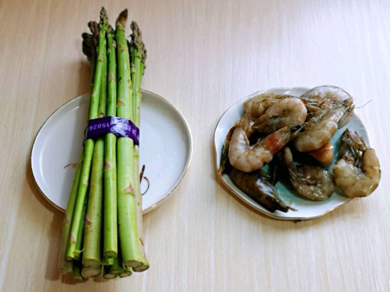 - Tôm tươi rửa sạch rồi lột vỏ và bỏ chỉ sau đó thêm rượu nấu ăn và lượng muối thích hợp vào, đảo đều rồi ướp trong 10 phút. Măng tây tươi cắt phần gốc già, rửa sạch rồi cắt thành từng đoạn chéo.