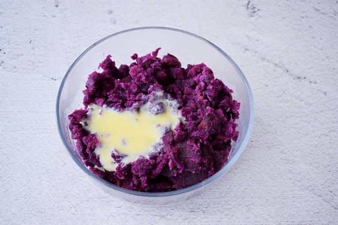 Khi khoai đã chín, cho ra bát rồi thêm sữa đặc vào, dùng muôi dầm và trộn thành hỗn hợp sệt.