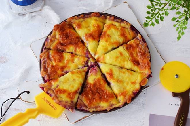 Cho bánh pizza khoai lang tím ra ăn nóng nhé!