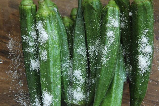 Lấy nước làm ướt đậu bắp, sau đó rắc một nắm muối, dùng tay vò sạch lớp lông tơ nhỏ trên đậu bắp rồi rửa sạch.