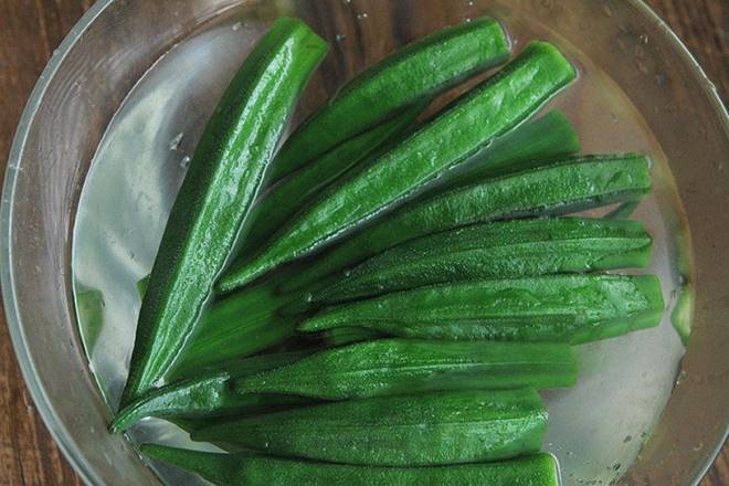 Đậu bắp cắt bỏ cuống. Cho nước vào nồi đun sôi, nêm 1 thìa cà phê muối và 1 thìa cà phê dầu ăn (cho dầu ăn và muối để đậu bắp giữ được màu xanh). Thả đậu bắp vào chần trong vòng 10 giây.