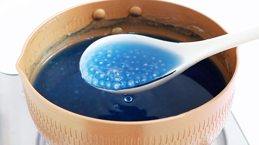 Cho 800ml nước vào nồi, thêm hoa đậu biếc vào đun ở lửa nhỏ, đun khoảng 4 phút cho hoa đậu biếc tiết sắc tố ra thì vớt bỏ hoa. Đổ bột báng vào luộc.
