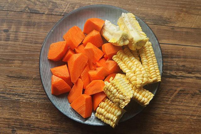 Cà rốt gọt vỏ, rửa sạch cắt miếng vừa ăn. Ngô bổ miếng nhỏ vừa ăn.