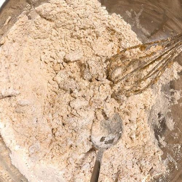 - Chia bột làm 3 lần đổ vào hỗn hợp bơ đường trộn đều tay.