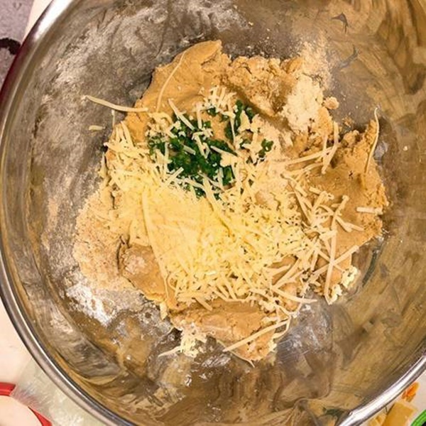 - Tiếp tục cho phô mai, bột tỏivà hành lá cắt nhuyễn vào và nhồi cho đều.