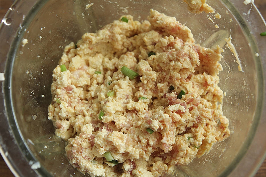 Thịt băm cho vào bát, thêm 1 muỗng dầu hào, nửa thìa rượu nấu ăn, thêm chút hành lá và gừng băm nhỏ vào. Đậu phụ bóp nhuyễn, cho vào bát thịt băm đảo đều. Đảo đều cho thấm gia vị.