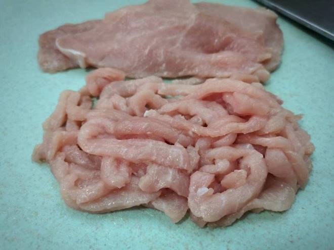 Thịt lợn rửa sạch, để ráo nước sau đó thái lát dày khoảng 5mm. Từ đó thái thịt thành các sợi dài.