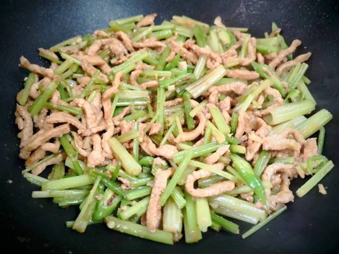 Cho thịt lợn xào cần tây ra đĩa ăn với cơm. Cần tây giòn ngon, thịt mềm đậm đà đảm bảo ai ăn cũng phải khen.
