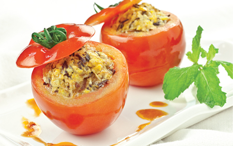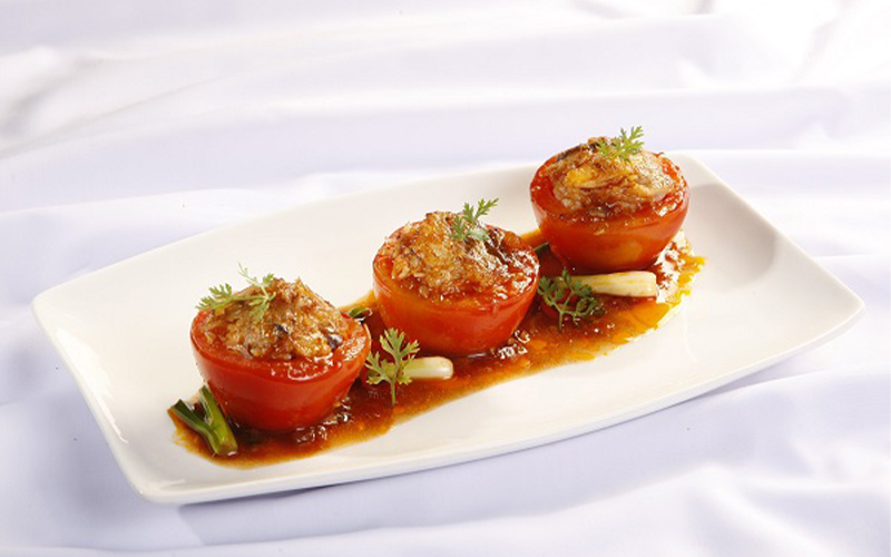 Cà chua dồn đậu hũ. Hương vị beo béo kết hợp với mùi đặc trưng của nấm và vị chua của cà chua, làm hương vị món ăn vô cùng đặc biệt. Món này ăn rất nhẹ bụng, tiêu hoá nhanh nhưng giúp bạn no lâu, kích thích cơ thể tiêu hoá nhiều mỡ thừa nên giảm cân rất hiệu quả.