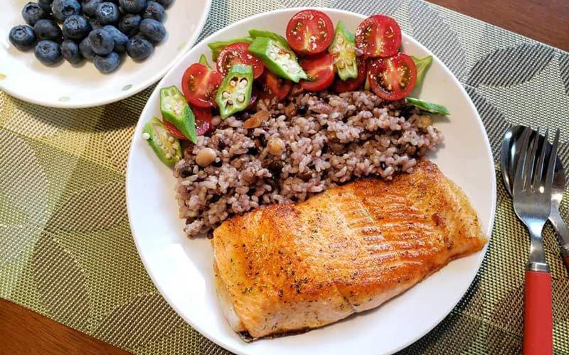 Cơm gạo lứt ăn kèm cá chiên, đậu bắp và cà chua