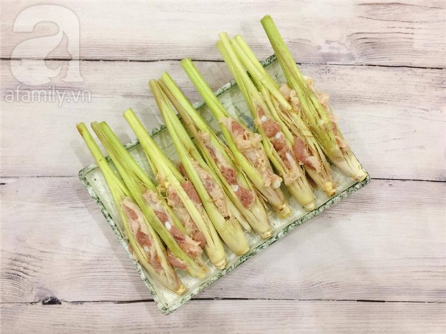 Kẹp từng miếng sụn vào cây sả theo chiều dọc, khéo léo đan xen các cọng sả để cố định miếng sụn.