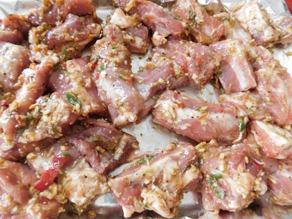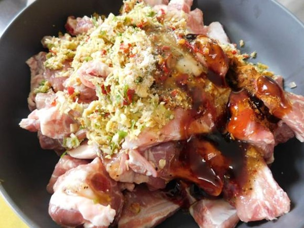 Bước 2: Sườn heo chặt miếng vừa ăn, sau đó rửa qua nước muối loãng rồi xả qua nước lạnh. Cho sườn vào âu cùng gia vị và nguyên liệu xay nhỏ trộn đều, ướp ít nhất 2 tiếng. Cho thịt ra khay có lót giấy bạc.