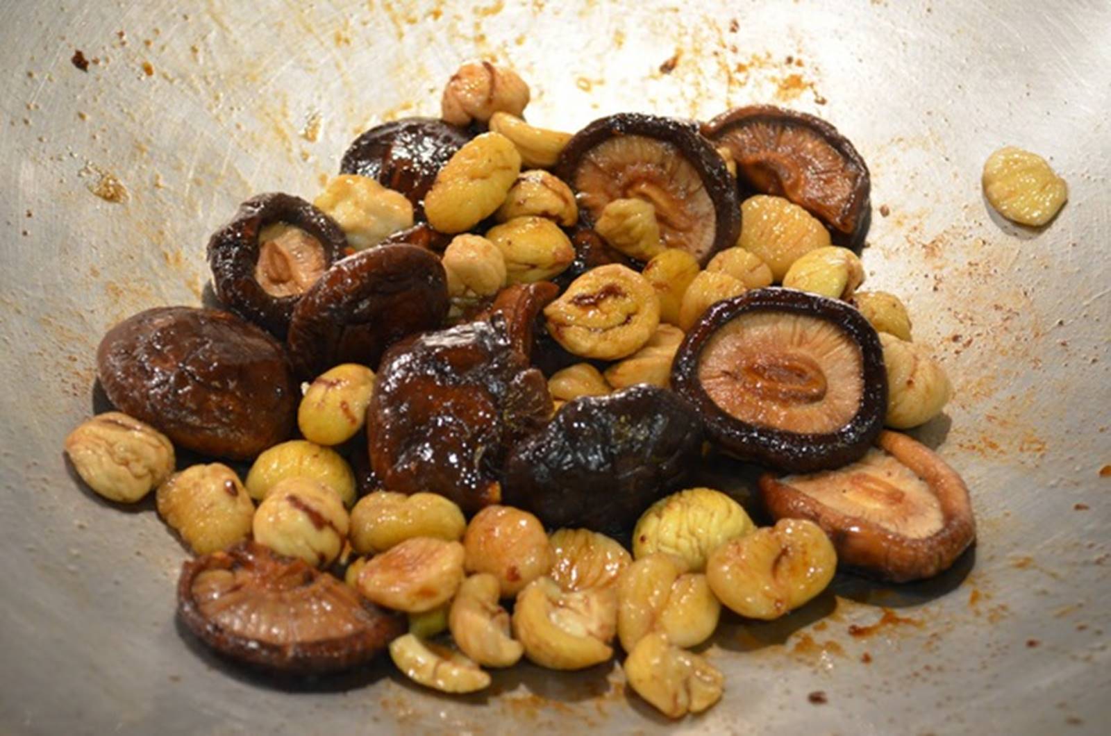 Bạn cho vào chảo 2 thìa cà phê dầu ăn và phi thơm phần hành tím đã băm nhỏ. Khi hành dậy mùi thơm, bạn cho nấm hương, hạt dẻ vào cùng 1 thìa canh dầu hào, đảo đều khoảng 1 phút trên lửa lớn.