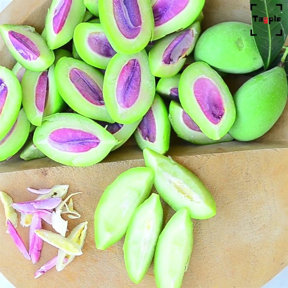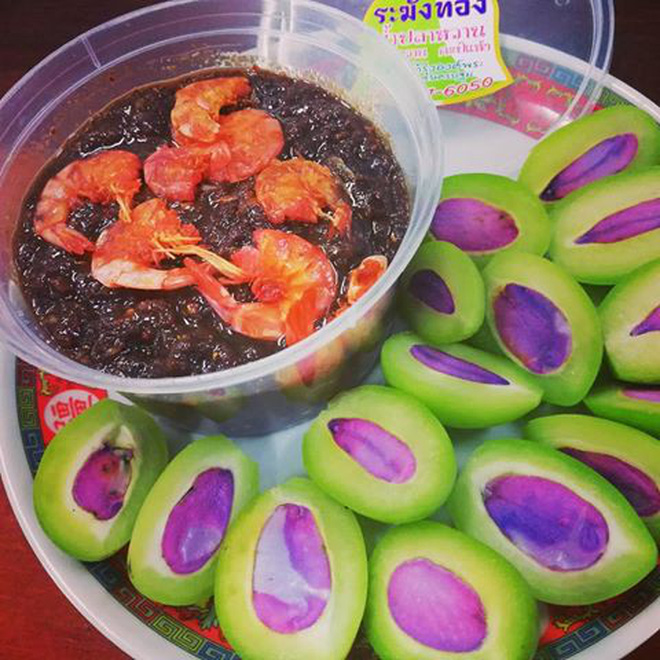 Thái Lan từ lâu đã vốn nổi tiếng với các loại trái cây chua chấm kèm mắm Thái, hay mắm đường ớt cay cay. Chỉ cần vô tình đi ngang nhìn thấy quầy trái cây bày bán dọc đường là bất cứ ai cũng khó kiềm lòng được. Thế nhưng, ở Thái Lan còn có một loại trái cây mới nhìn qua bảo đảm bạn sẽ khó biết đây là loại quả gì bởi nó vừa giống cóc non, khi chín thì vàng ươm tròn tròn như quả mơ. Tuy nhiên, điểm thu hút nhất của loại quả này là phần ruột có màu tím nhạt rất đẹp mắt.